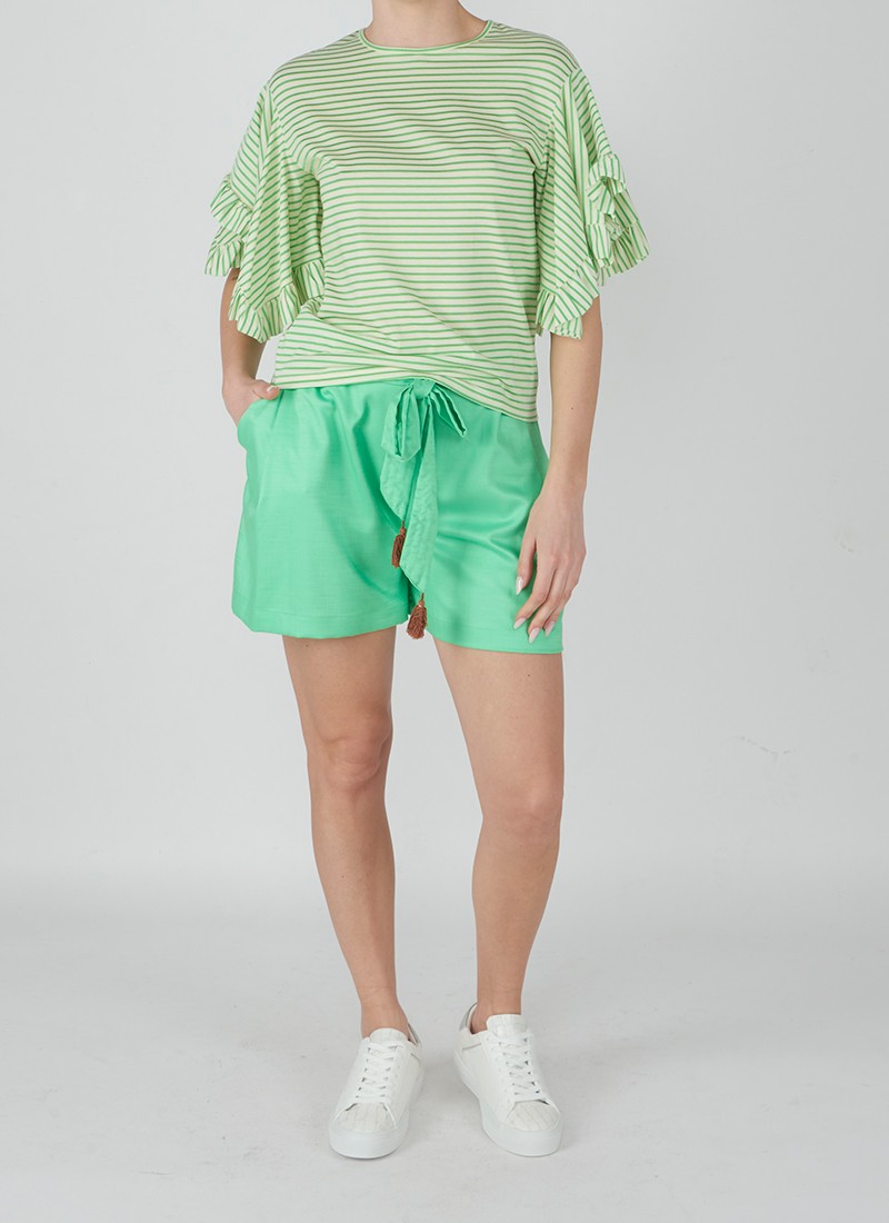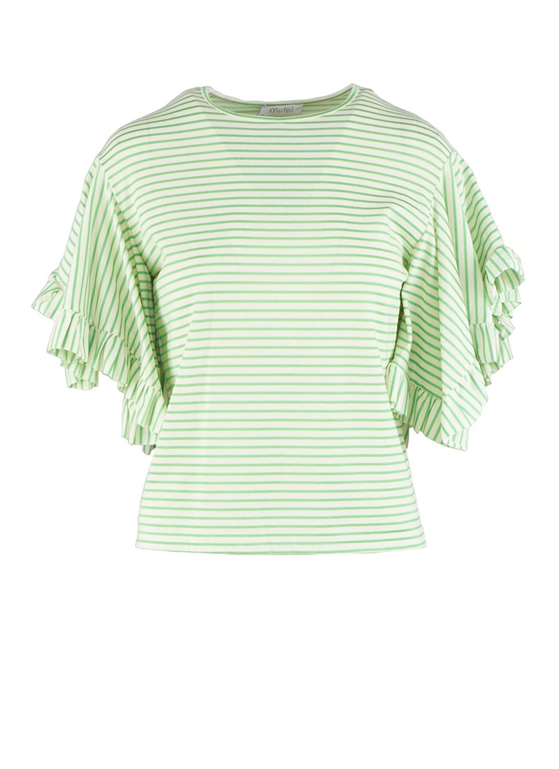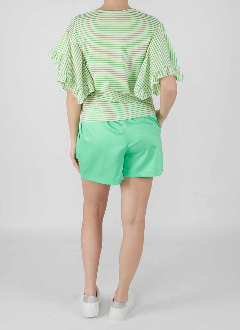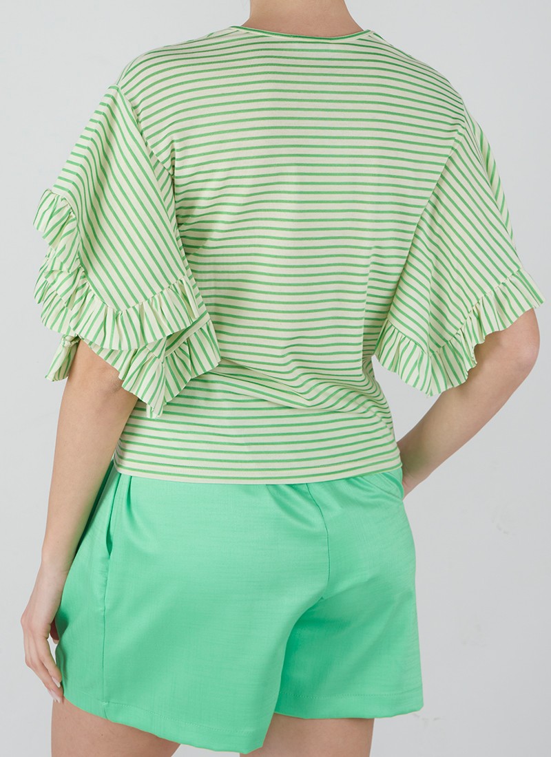 T-shirt a righe orizzontali verdi a contrasto con maniche corte con rouches.